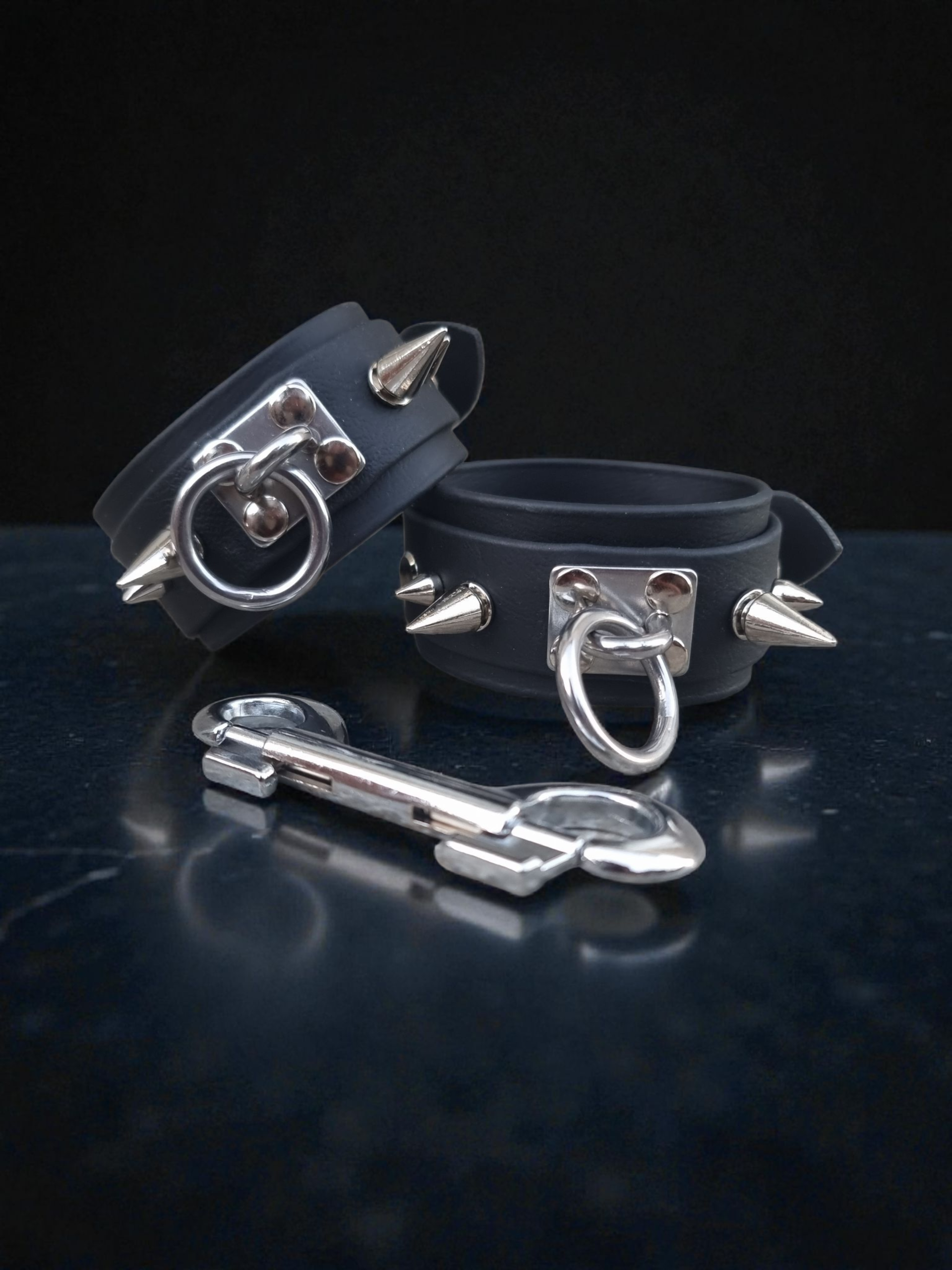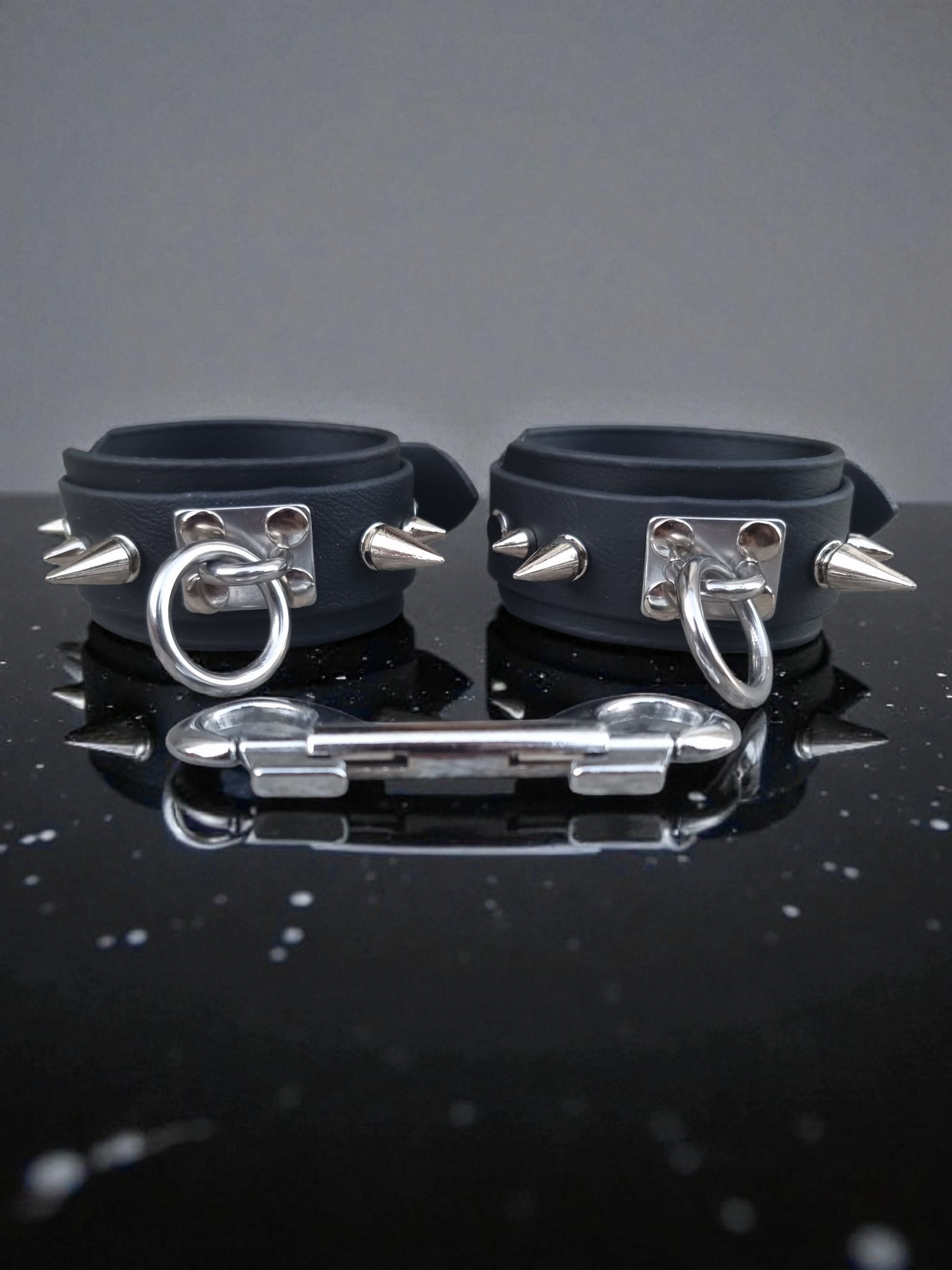 La tension entre les deux menottes, tendue par le mousqueton, raconte une histoire de proximité et de pouvoir partagé.